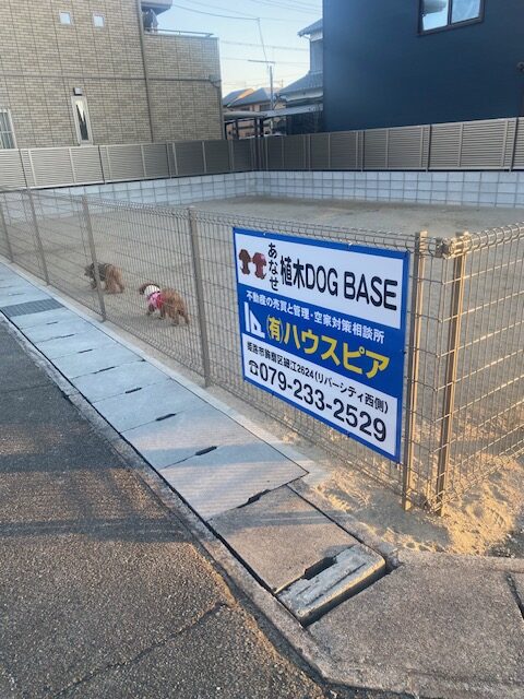 飾磨区阿成植木に当社所有地にフェンスで囲みワンちゃんの憩いの場所を作りました。私の犬2匹をはじめとして近所に多くのワンちゃん飼主が住まれ散歩されているのを見て遊休地に犬主?(笑)とワンちゃんが楽しく過ごせる場所を作りました。もちろん無料ですが、当初は顔見知りさんの利用でいこうかな?と思います。知らない人が、知らないうちにフンの後始末などの使われ方が続いたら私のメンタルも壊れて「もうや~めた!」になりそうなので(笑)