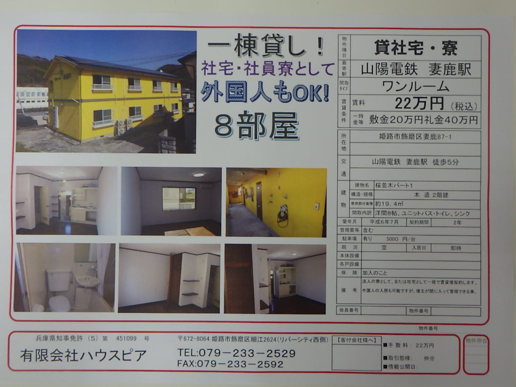 飾磨区妻鹿の駅近くに1棟丸ごとの貸し出し物件が出ました。同僚ばかりなので気兼ねなく(上司だと多少気兼ねする?)生活を営めます。法人契約なので入居者が入れ替わっても名前と連絡先などを伝えていただければ大丈夫なので、昨今の人手不足の解消のための外国人研修生も住んでいただけます。外国人の入居が難しいですが、ここならば新たな研修生がとも入替が出来ます。めったに出ない物件ですのでお見逃しなく内覧してください!