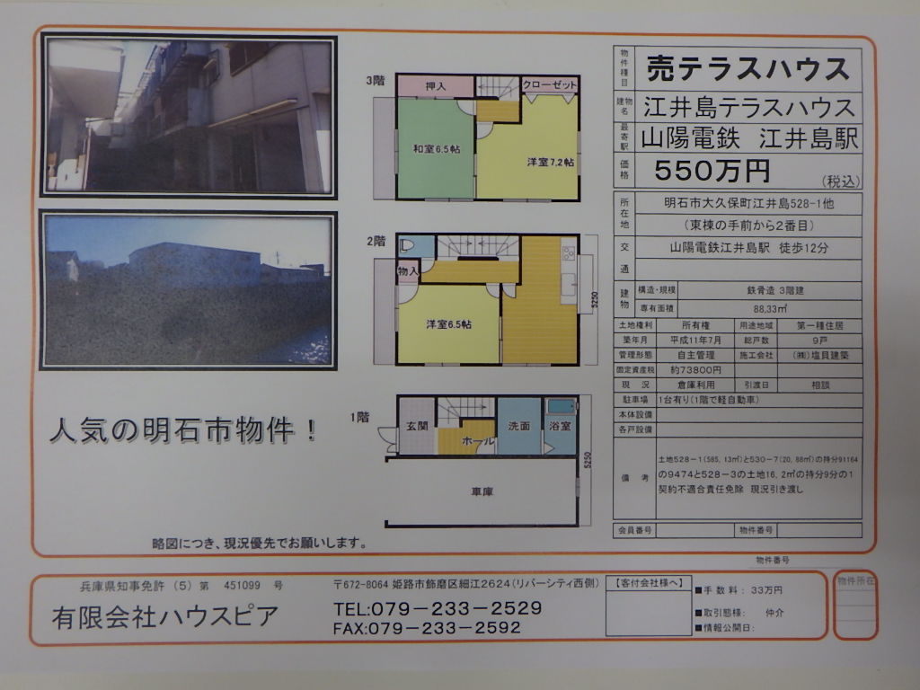 人気の明石市江井島に鉄骨造3階建てのテラスハウス出ました。住居にも良し、収益物件にも良し。